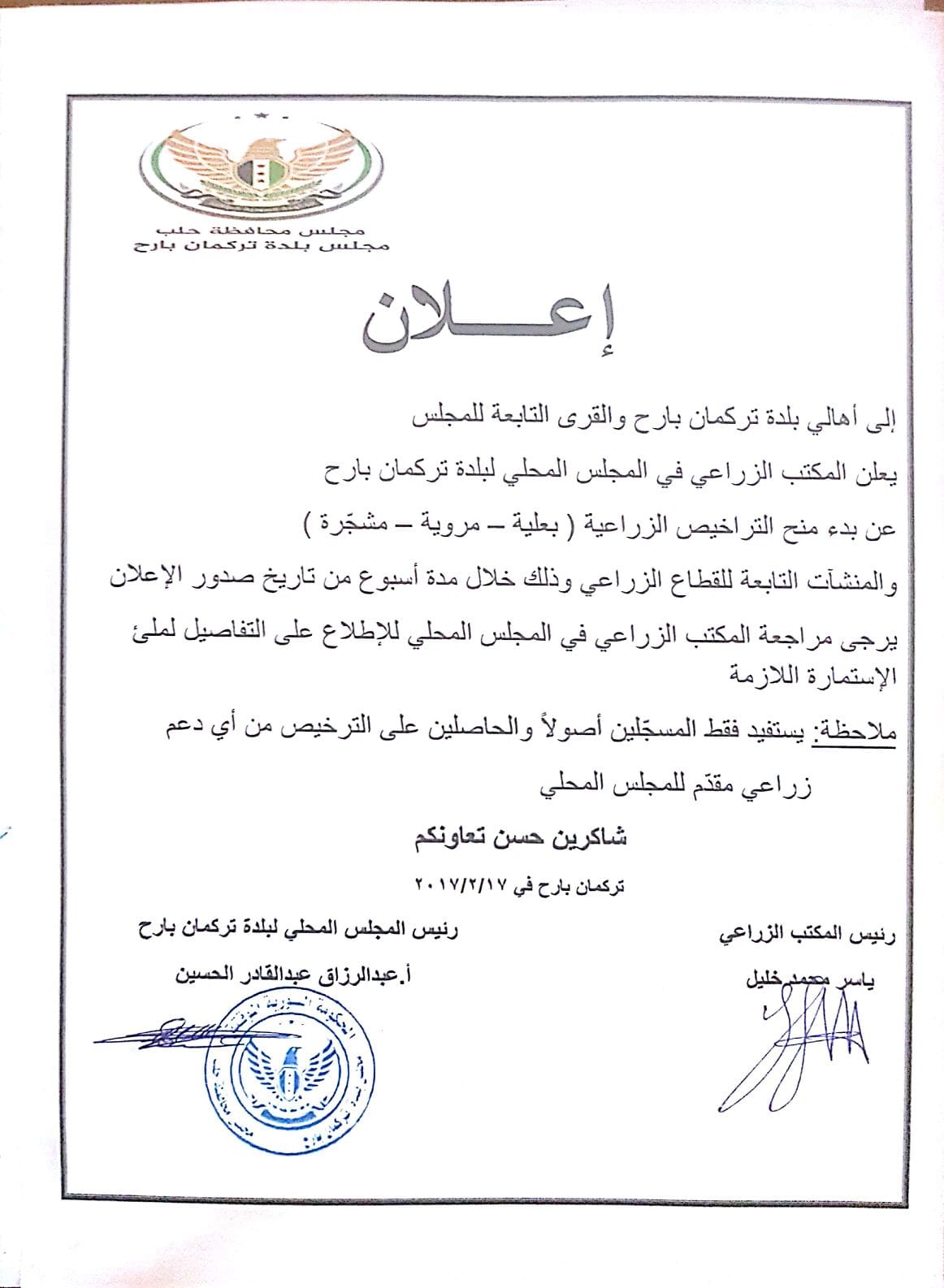 المجلس المحلي لبلدة تركمان بارح يعلن عن بدء منح التراخيص الزراعية