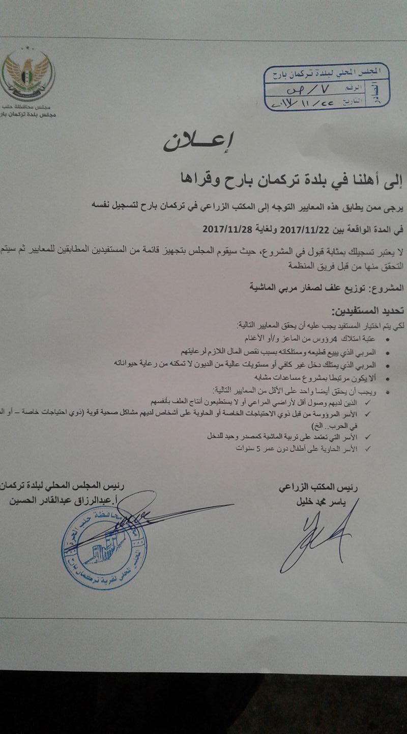 تعميم من المجلس المحلي لبلدة تركمان بارح إلى أصحاب الأراضي الزراعية للتسجيل على مشروع توزيع علف