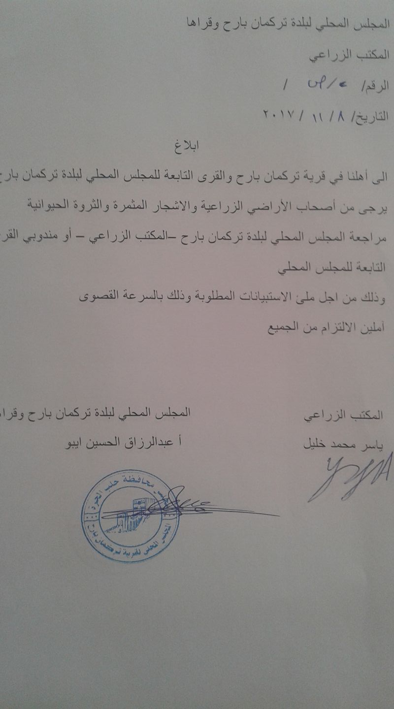 إبلاغ إلى أصحاب الأراضي الزراعية و الأشجار المثمرة و الثروة الحيوانية مراجعة السيد رئيس المكتب الزراعي لدى المجلس