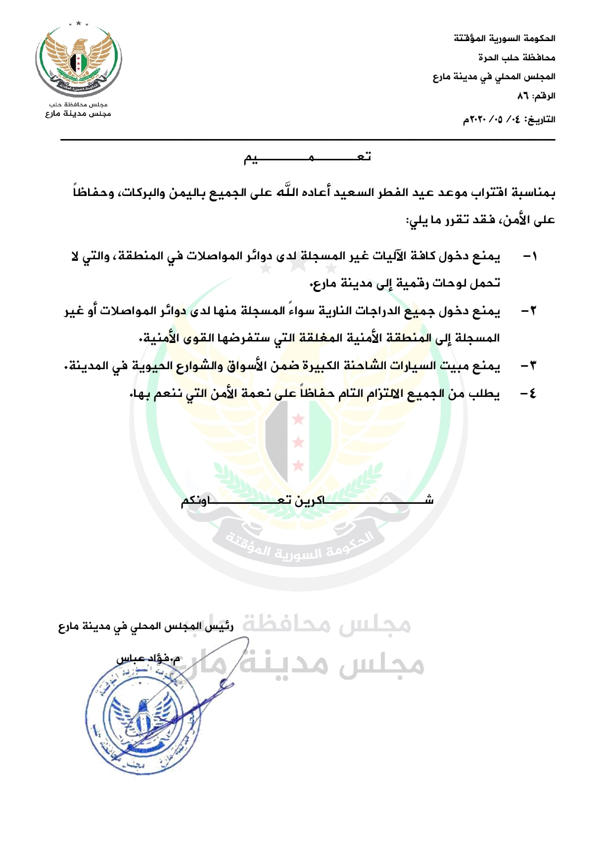 1- يمنع دخول كافة الآليات غير المسجلة لدى دوائر المواصلات في المنطقة، والتي لا تحمل لوحات رقمية إلى مدينة مارع.