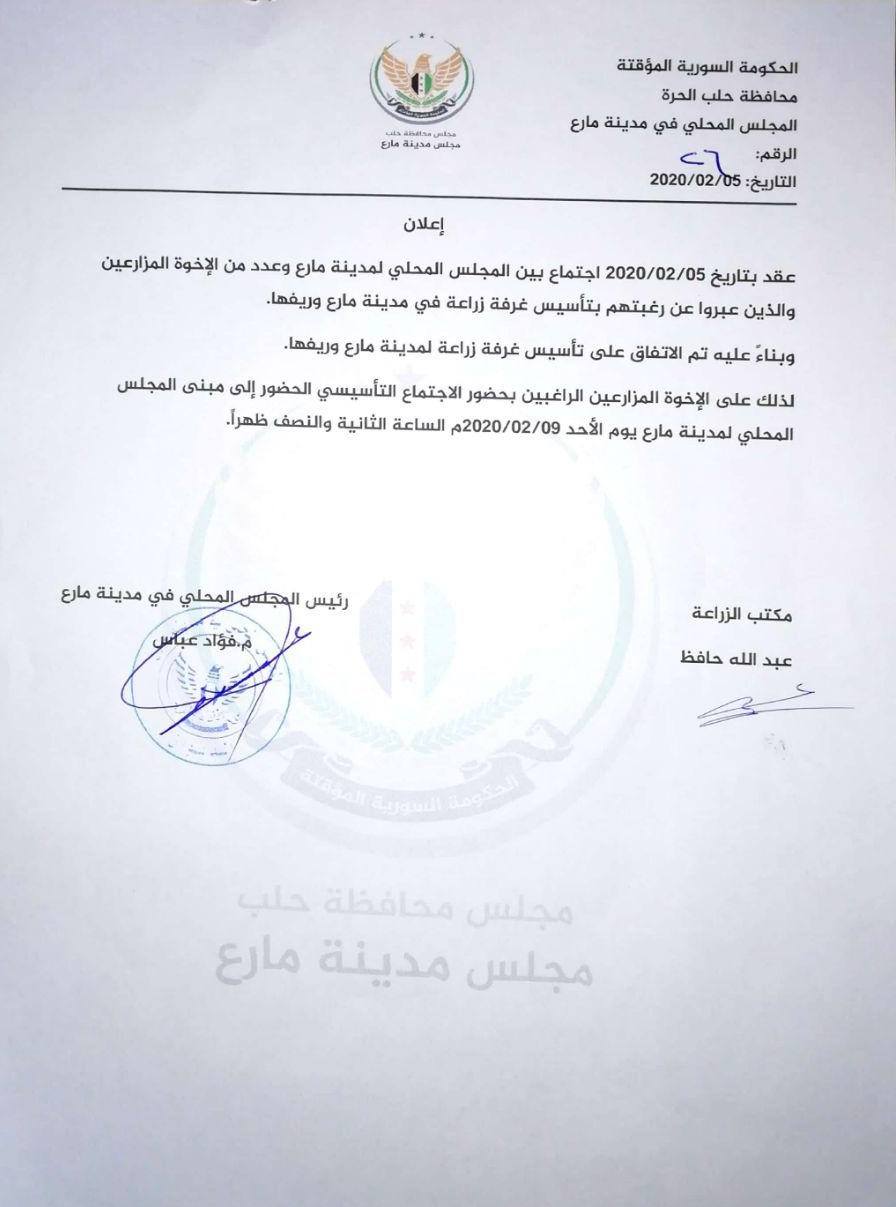 إعلان حول الاتفاق على تأسيس غرفة زراعة لمدينة مارع وريفها