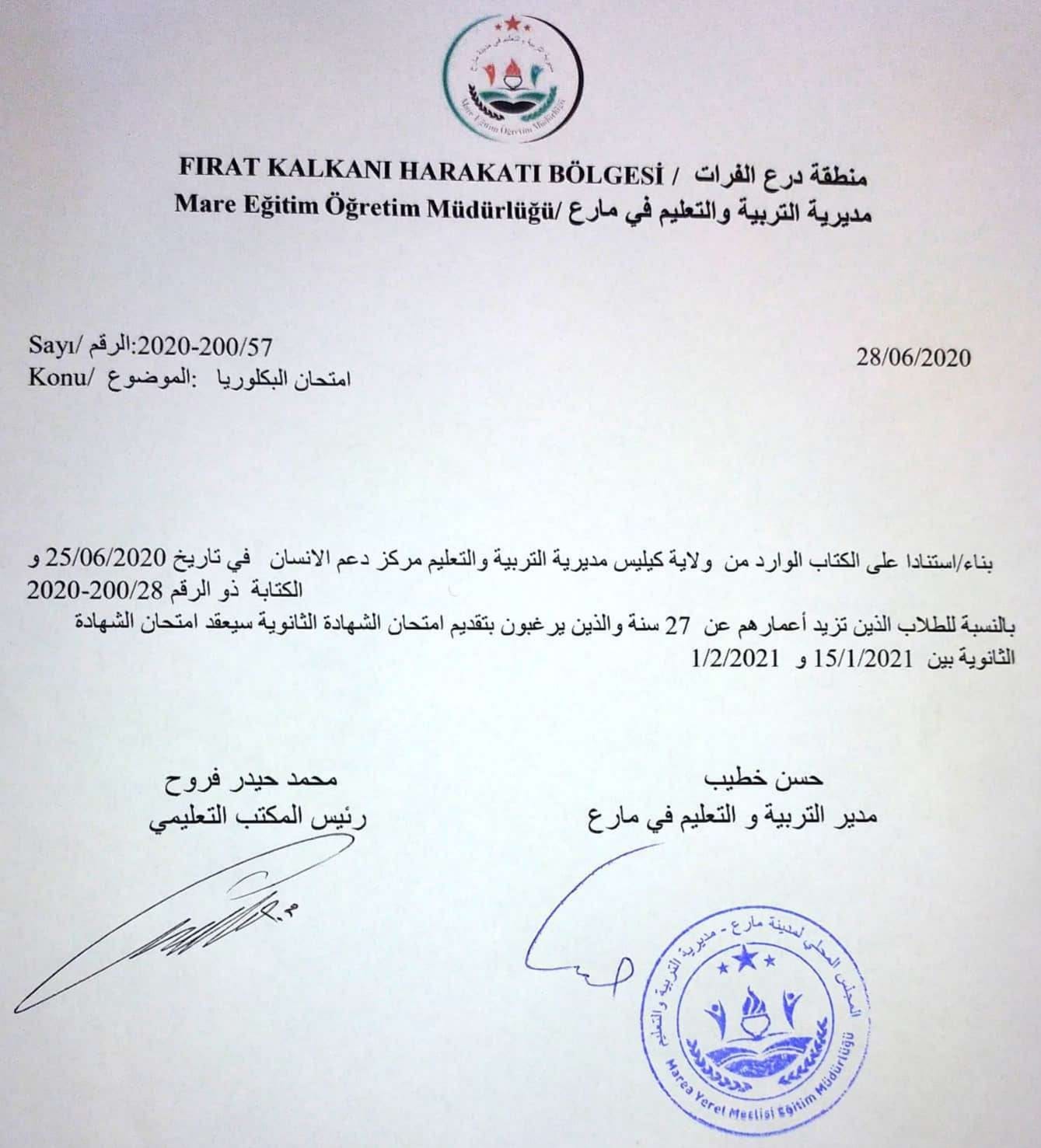 تعميم مديرية التربية والتعليم في مدينة مارع بشأن الطلاب الذين تزيد أعمارهم عن 27 عاماً ويرغبون بتقديم امتحان الشهادة الثانوية