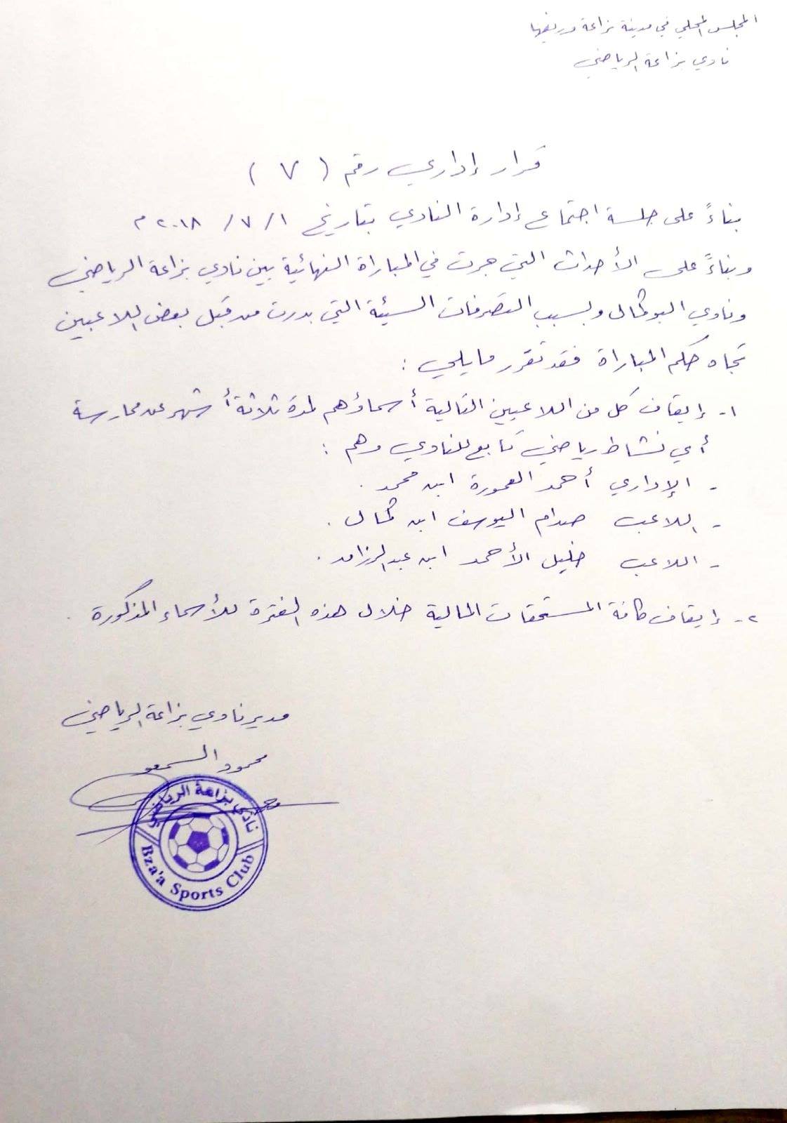 قرار إداري بمعاقبة بعض اللاعبين بسبب التصرفات السيئة التي بدرت تجاه حكم المباراة