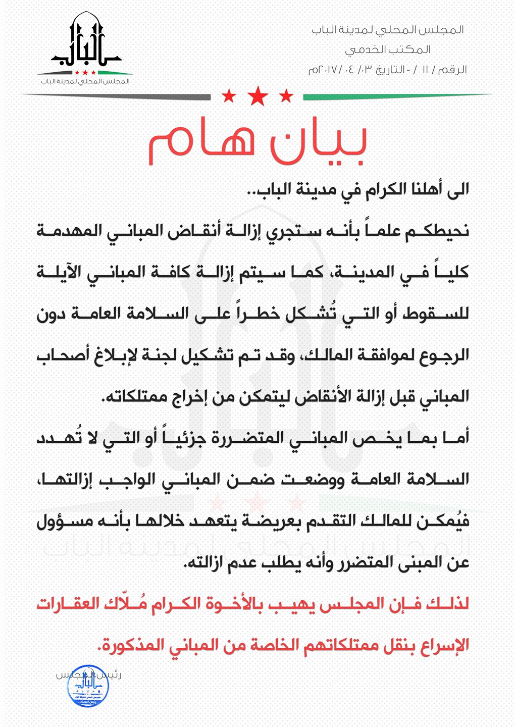 بيان هام الى أهالي مدينة الباب بشأن إزالة أنقاض المباني المهدمة كلياً في المدينة