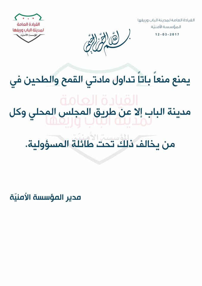 يمنع منعاً باتاً تداول مادتي القمح والطحين في مدينة الباب، إلّا عن طريق المجلس المحلي لمدينة الباب، وكل من يخالف ذلك، تحت طائلة المسؤولية.