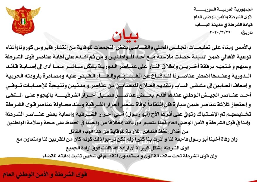 بيان توضيحي حول ما حصل يوم أمس في مدينة الباب من اعتداء على عناصر الشرطة