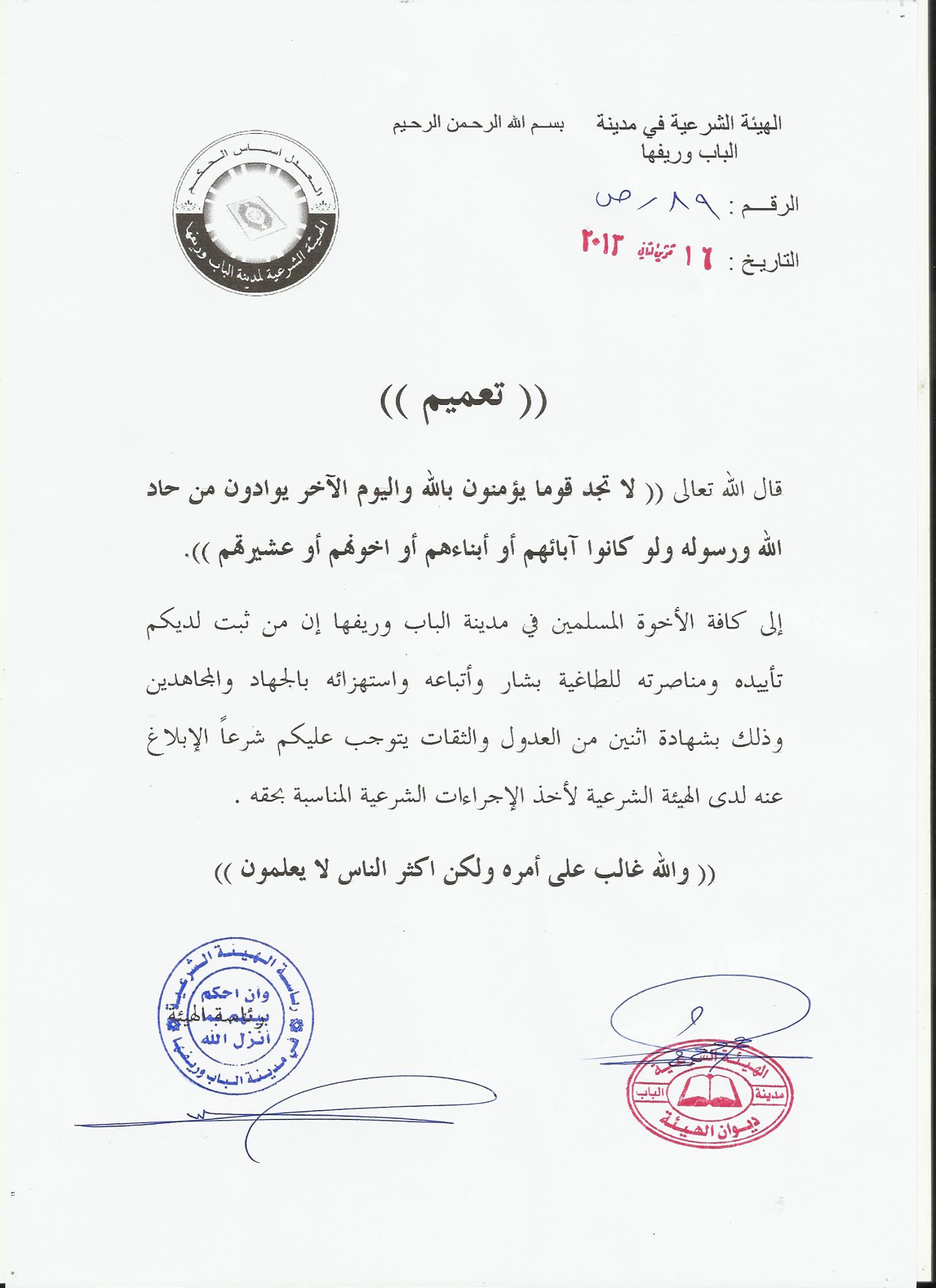إلى كافة الأخوة المسلمين في مدينة الباب وريفها إن من ثبت لديكم تأييده ومناصرته للطاغية بشار وأتباعه واستهزائه بالجهاد والمجاهدين وذلك بشهادة اثنين من العدول والثقات يتوجب عليكم شرعاً الإبلاغ عنه لدى الهيئة الشرعية لأخذ الإجراءات الشرعية المناسبة بحقه .