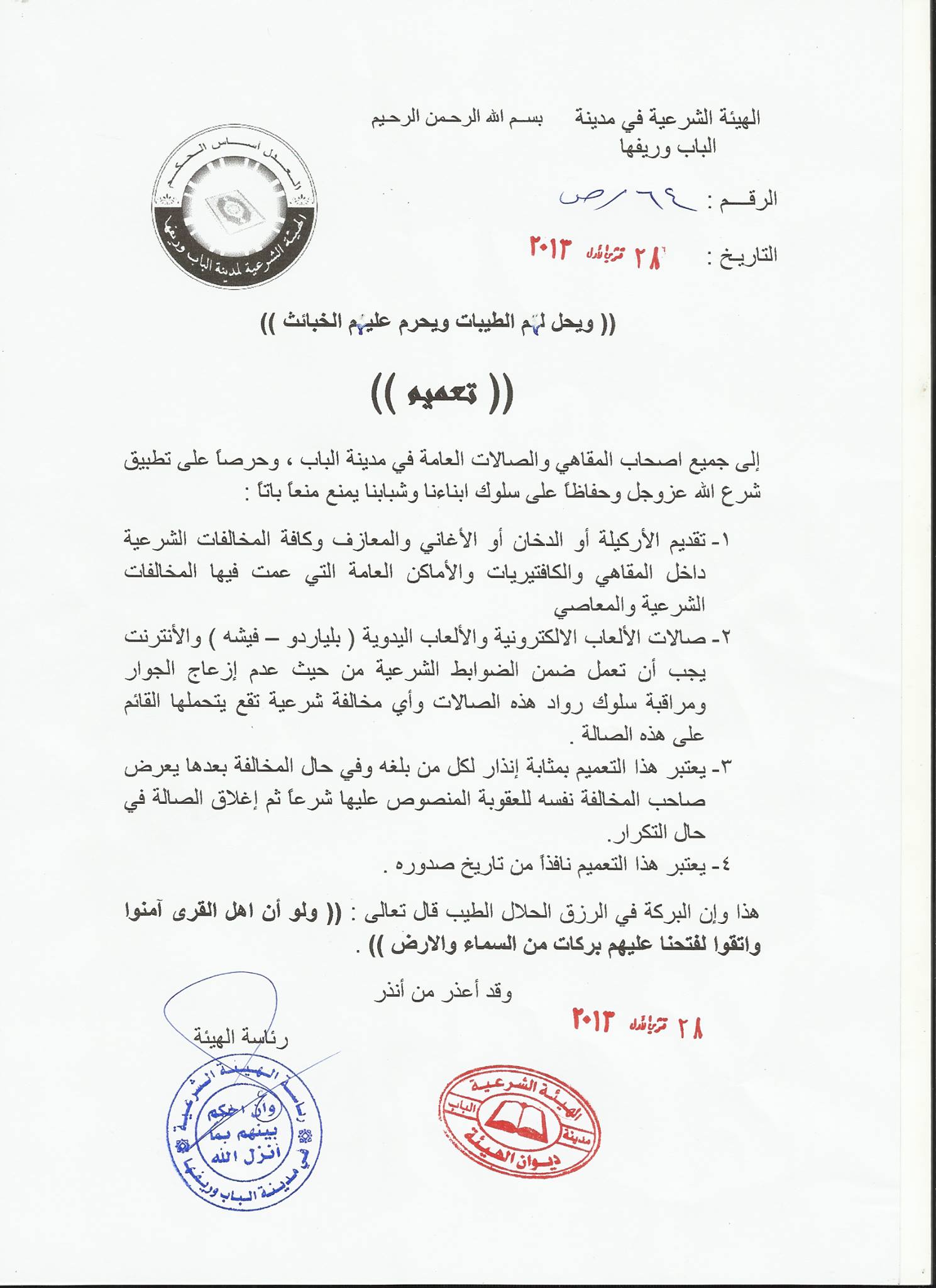 تعميم من الهيئة الشرعية في مدينة الباب وريفها إلى جميع أصحاب المقاهي والصالات العامة في مدينة الباب