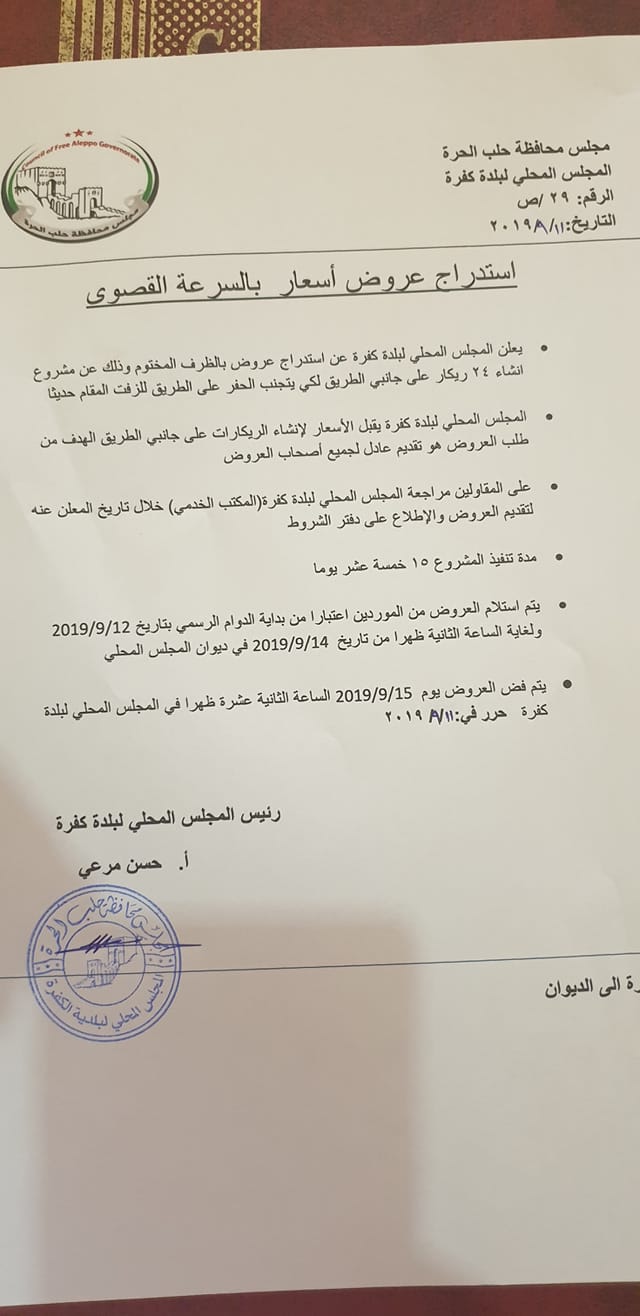إعلان مناقصة بشأن استدراج عروض أسعار بالسرعة القصوى لإنشاء ريكارات على جانبي الطريق الرئيسي