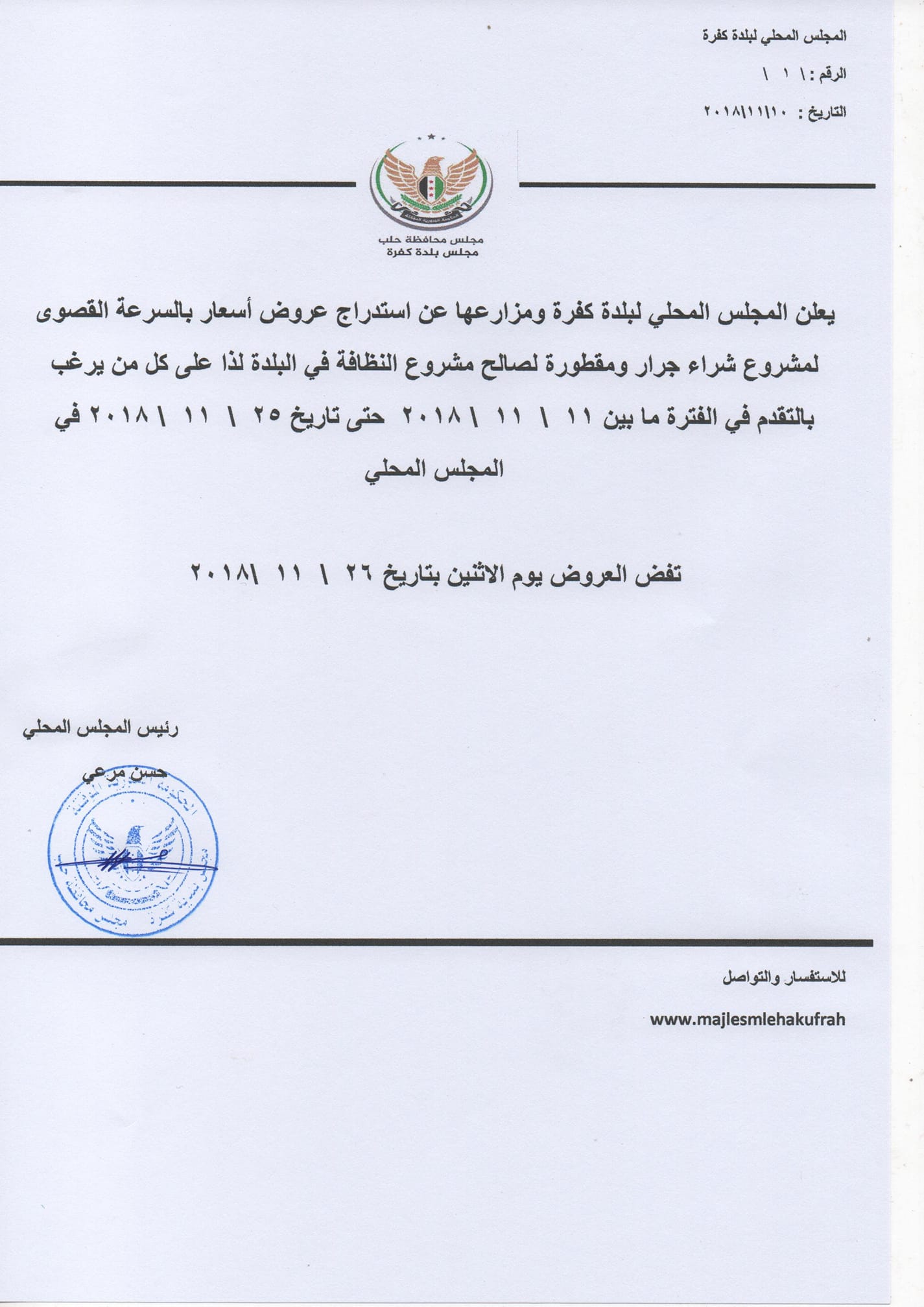 يعلن المجلس المحلي لبلدة كفرة عن استدراج عروض أسعار بالسرعة القصوى لمشروع شراء جرار ومقطورة لصالح مشروع النظافة في البلدة لذا على كل من يرغب بالتقدم في الفترة ما بين ٢٠١٨/١١/١١ حتى تاريخ ٢٠١٨/١١/٢٥ في المجلس المحلي