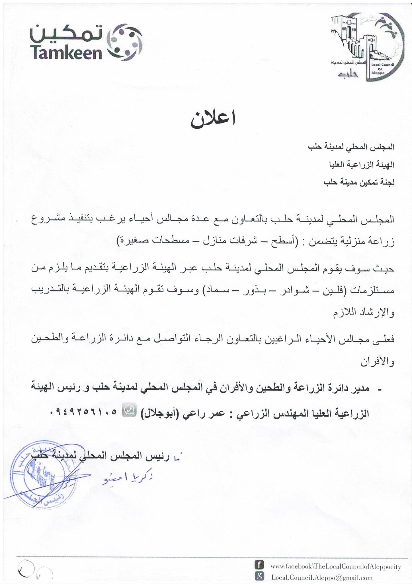 إعلان المجلس المحلي لمدينة حلب حول تنفيذ مشروع الزراعة المنزلية
