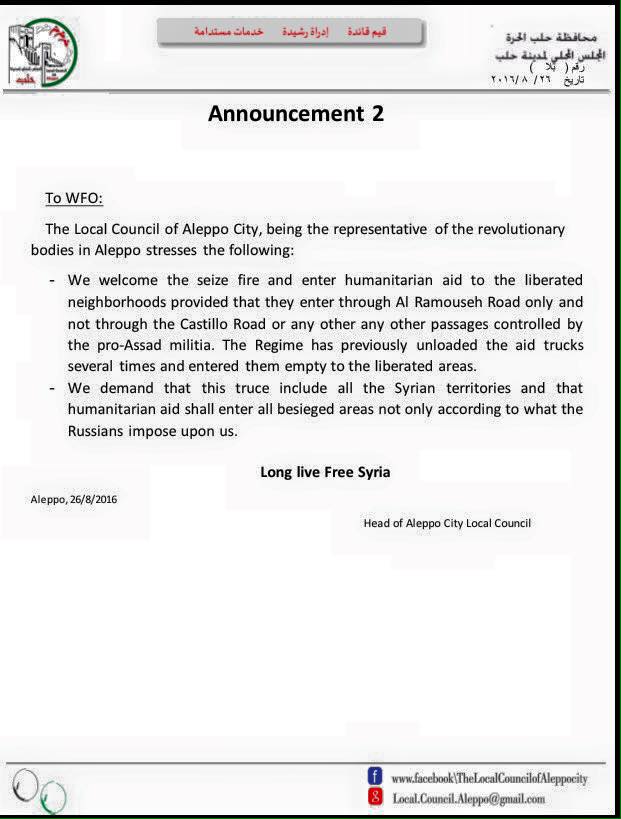 Announcement 2The Local Council of Aleppo City, being the representative of the revolutionary bodies in Aleppo stresses the following:- We welcome the seize fire and enter humanitarian aid to the liberated neighborhoods provided that they enter through Al Ramouseh Road only and not through the Castillo Road or any other any other passages controlled by the pro-Assad militia. The Regime has previously unloaded the aid trucks several times and entered them empty to the liberated areas.- We demand that this truce include all the Syrian territories and that humanitarian aid shall enter all besieged areas not only according to what the Russians impose upon us.Long live Free SyriaHead of Aleppo City Local Counciيان / 2 /