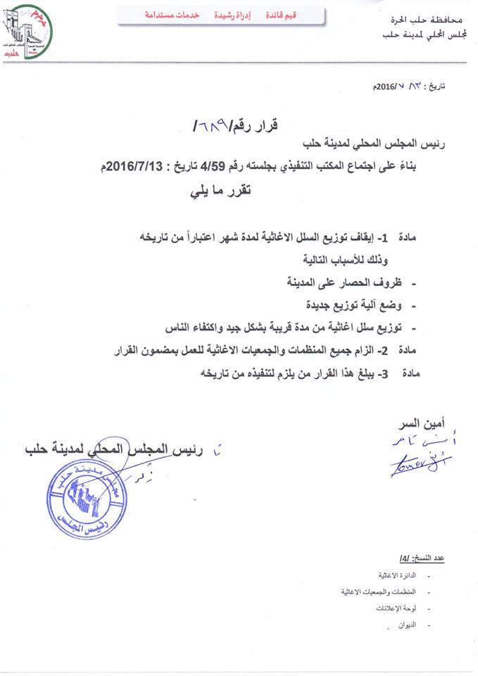 قرار من المجلس المحلي بإيقاف توزيع السلل الغذائية لمدة شهر اعتباراً من تاريخ هذا القرار