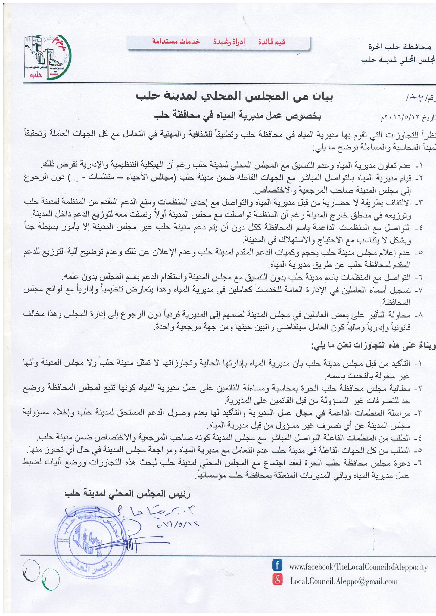 بيان من المجلس المحلي لمدينة حلب بخصوص عمل مديرية مياه محافظة حلب حلب