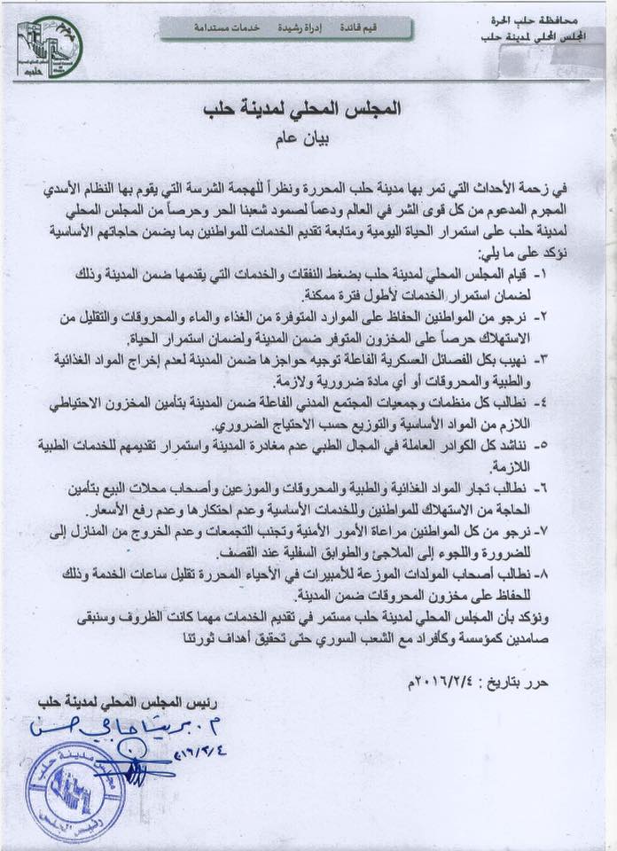 بيان من المجلس المحلي لمدينة حلب حول الهجمة الشرسة التي تتعرض لها مدينة حلب و التأكيد على الحفاظ على مقومات الصمود في المدينة