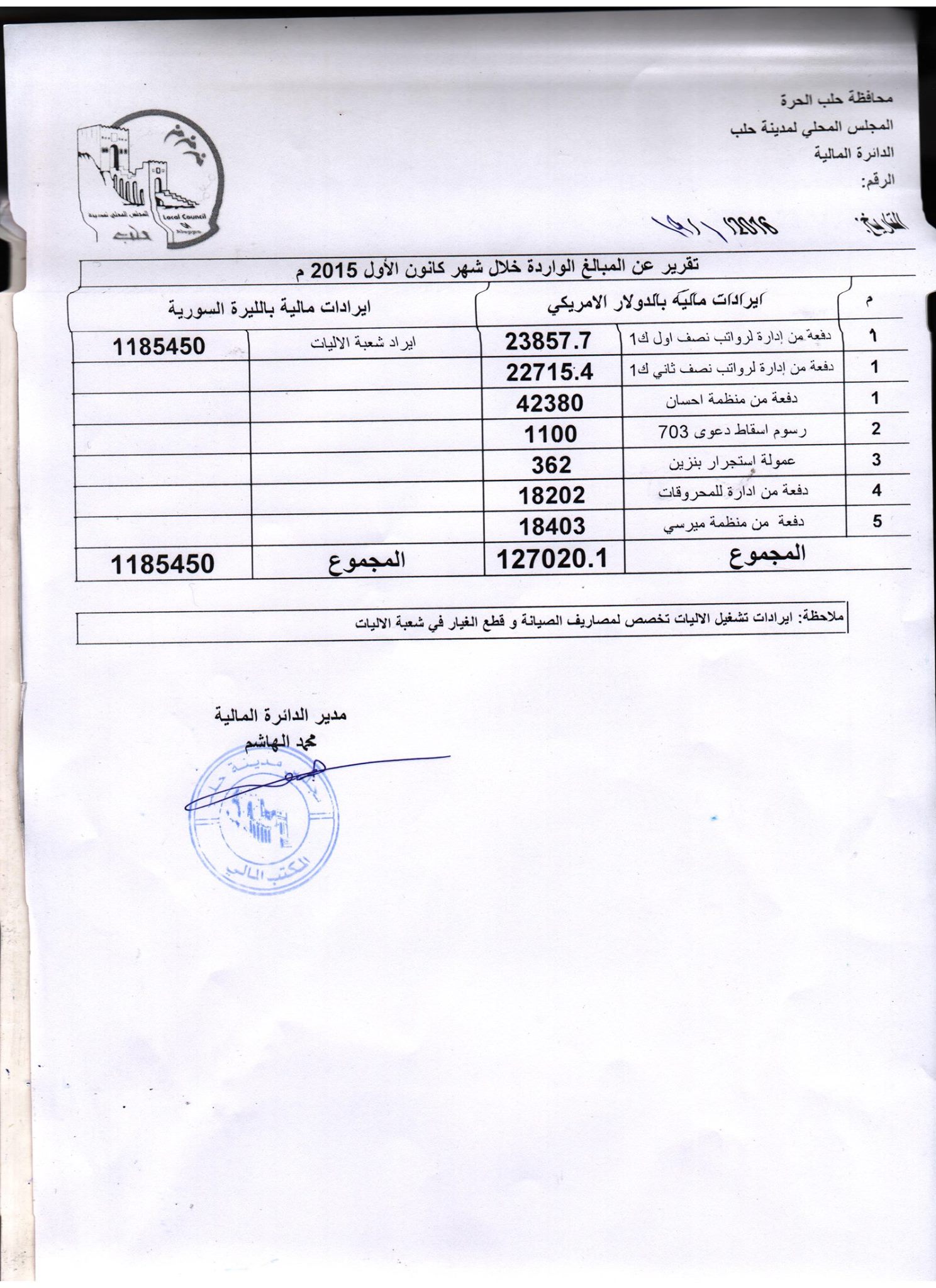 تقرير من المجلس المحلي لمدينة حلب حول المبالغ الواردة خلال شهر كانون الأول 2015
