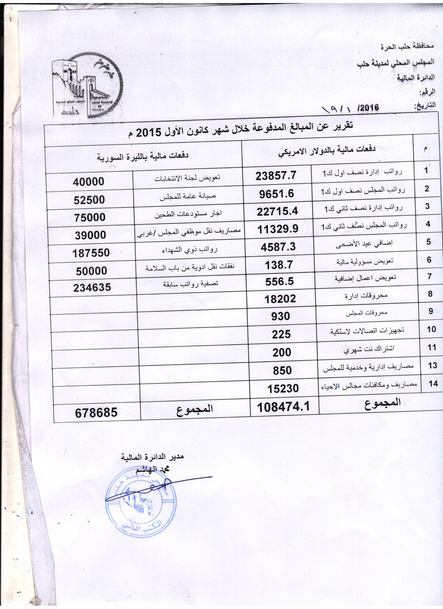 تقرير من المجلس المحلي لمدينة حلب حول المبالغ المدفوعة خلال شهر كانون الأول 2015