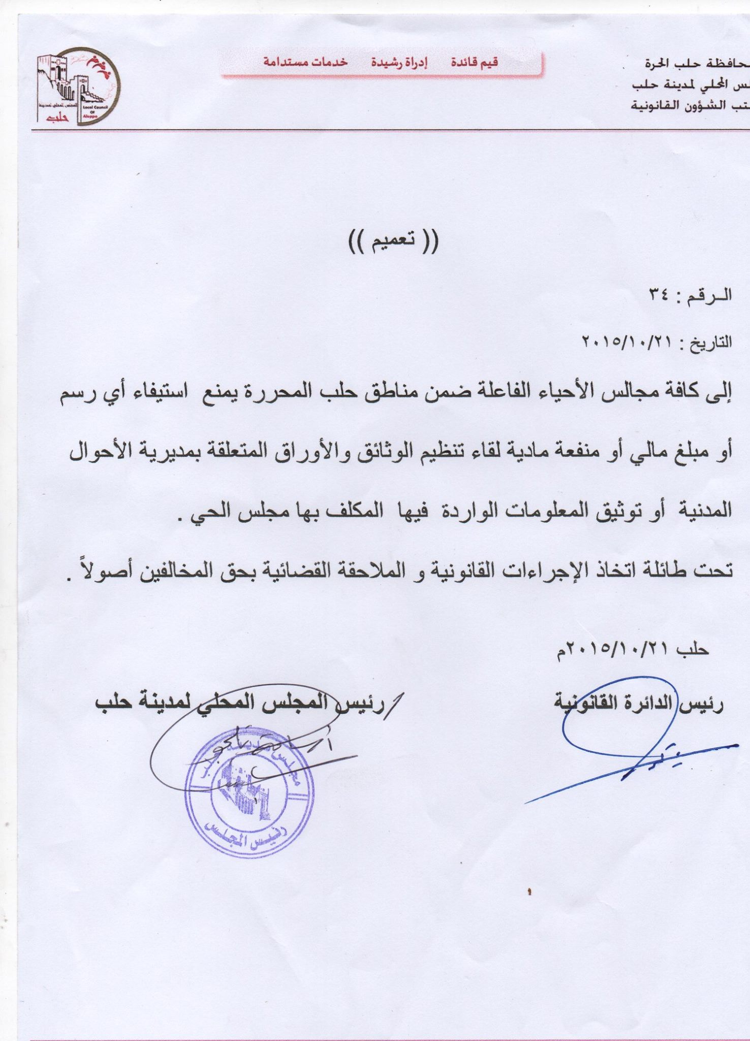 تعميم إلى كافة مجالس الأحياء الفاعلة ضمن مناطق حلب المحررة بمنع استيفاء أي رسم أو مبلغ مالي أو منفعة مادية لقاء تنظيم الوثائق والأوراق المتعلقة بمديرية الأحوال المدنية