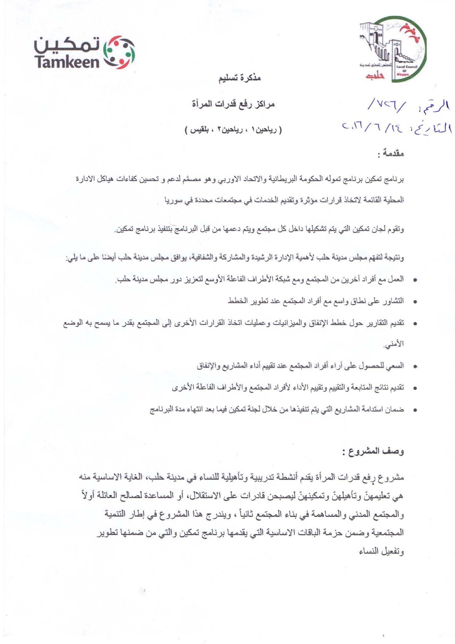 مذكرة تسليم مراكز رفع قدرات المرأة ( رياحين1 - رياحين2 - بلقيس )