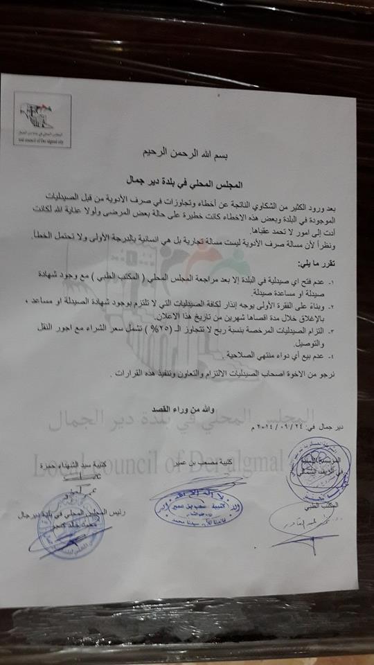 قرار إداري بعدم فتح أي صيدلية إلا بعد مراجعة المجلس المحلي مع وجود شهادة الصيدلة أو مساعد صيدلي