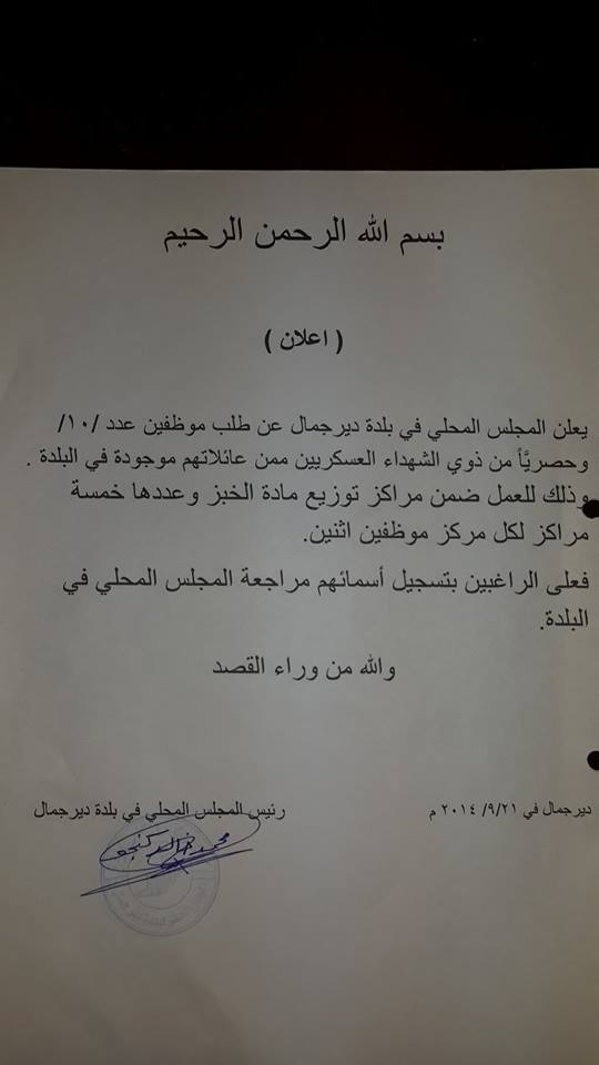 إعلان من المجلس المحلي في بلدة ديرجمال يعلن فيه عن حاجته لموظفين عدد (10) من ذوي الشهداء العسكريين الموجودين في البلدة