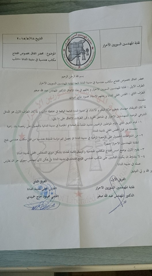 محضر اتفاق بخصوص افتتاح مكاتب هندسية في مدينة الدانا تابعة لنقابة المهندسين السوريين الأحرار