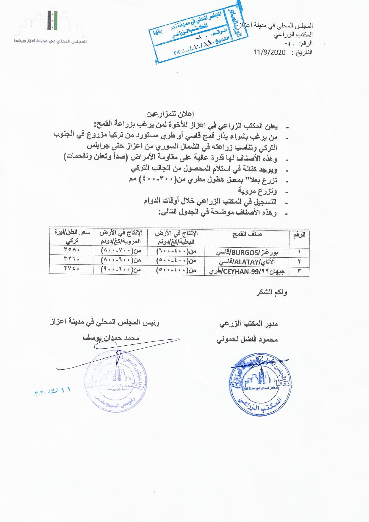 إعلان من المجلس المحلي لمدينة إعزاز إلى المزارعين الراغبين بزراعة مادة القمح المستورد من تركيا