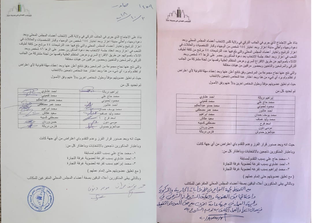قائمة اعضاء مجلس مدينة اعزاز والتي تم تصديقها برعاية ولاية كيليس وفقا للاجتماع الذي اعتمد فيه نتائج الانتخابات التي جرت بحضور اهالي ووجهاء من مدينة اعزاز في ولاية كيليس