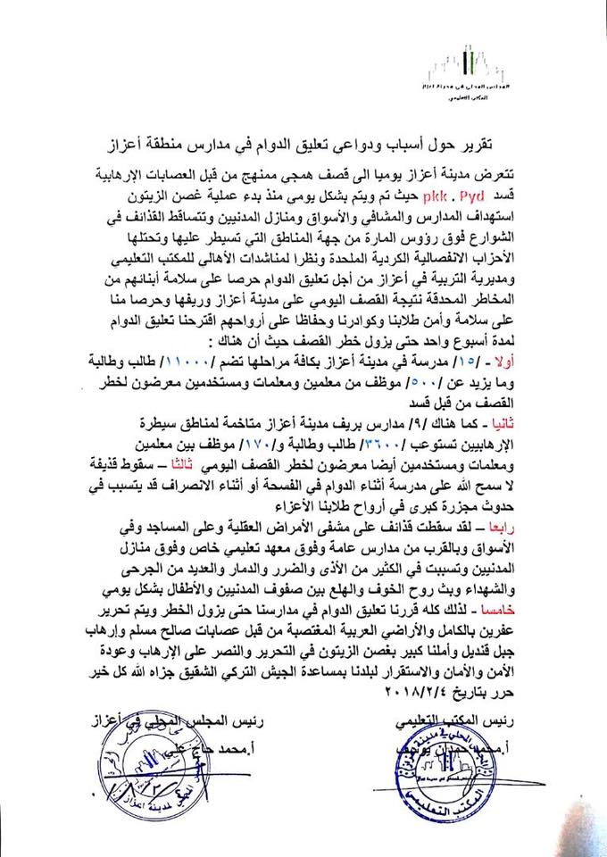 تقرير حول أسباب ودواعي تعليق الدوام في مدارس منطقة اعزاز