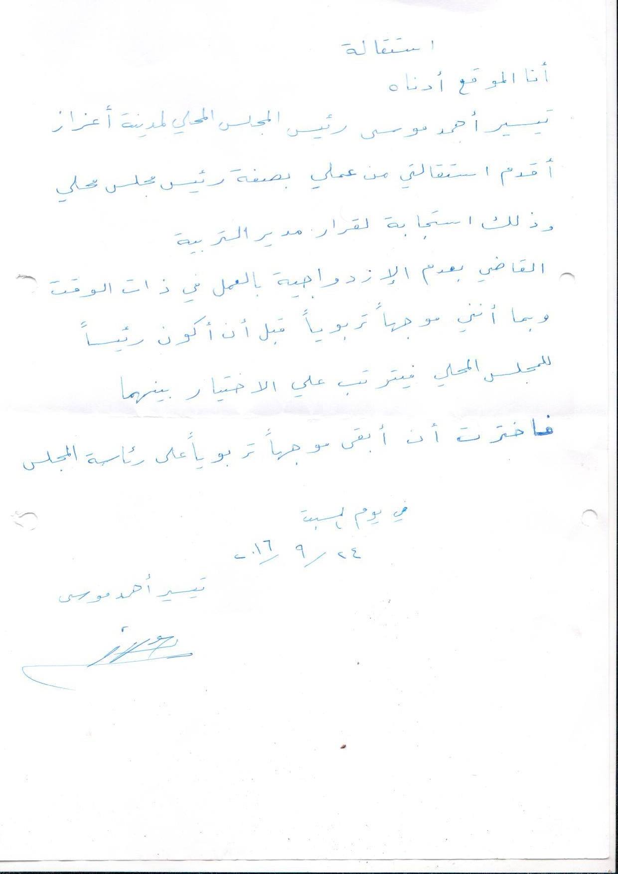 بيان ستقالة رئيس المجلس المحلي تيسير أحمد موسى من منصبه منعاً لزدواجية المنصب