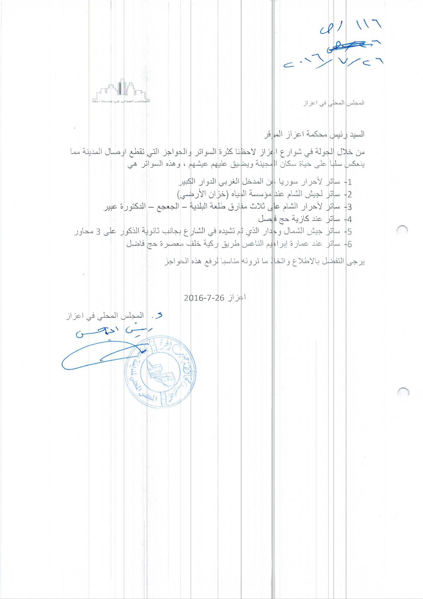 كتاب من المجلس المحلي في مدينة اعزاز إلى رئيس محكمة اعزاز حول الحواجز والسواتر والترابية المنتشرة في المدينة وإصدار الأوامر بإزالتها