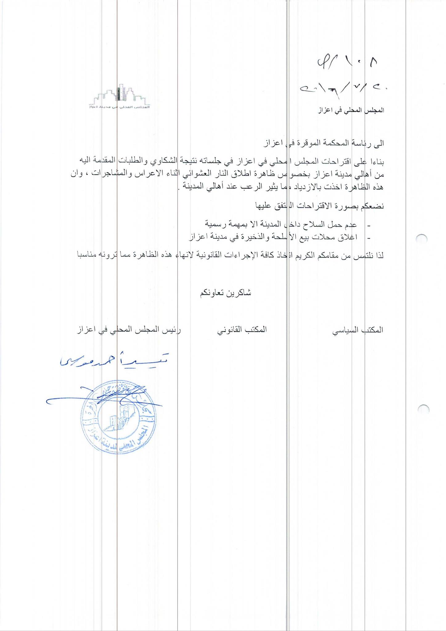 المجلس المحلي يقدم لرئاسة اقترحات التي تم الإتفاق عليها بعدم حمل السلاح داخل المدينة إلا بمهمة رسمية وإغلاق محال بيع السلاح والذخيرة في مدينة اعزاز