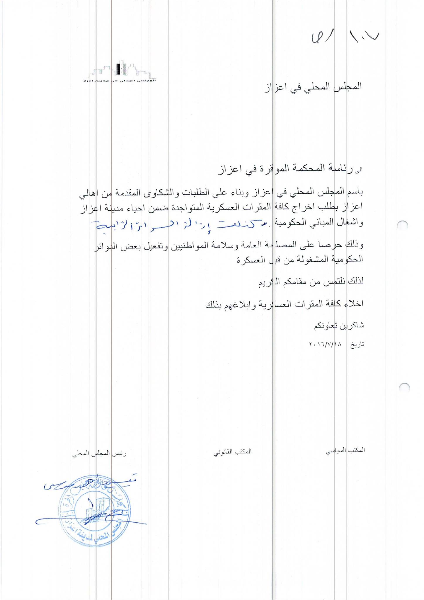 المجلس المحلي يطلب من من رئاسة المحكمة المركزية إخراج كافة المقرات كافة المقرات العسكرية المتواجدة ضمن مدينة اعزاز إلى خارج المدينة