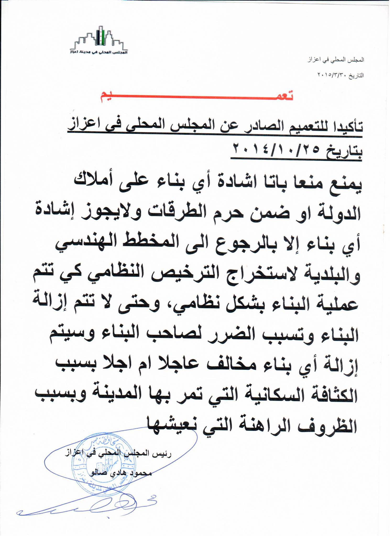 تعميم من المجلس المحلي لمدينة إعزاز تأكيداً على منع إشادة أي بناء على أملاك الدولة إلا بعد الحصول على الترخيص اللازم