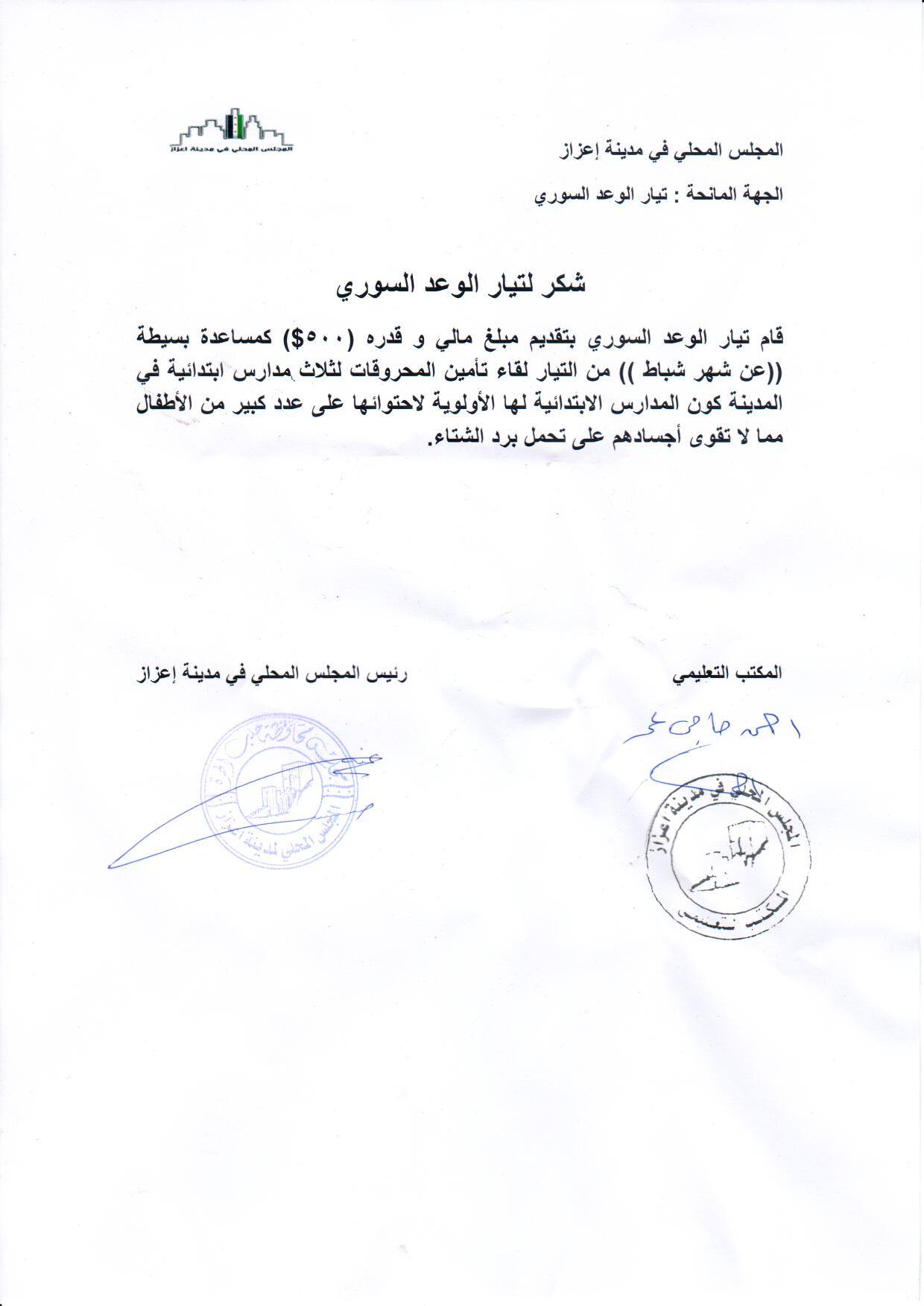 بيان شكر من المجلس المحلي في مدينة اعزاز لتيار الوعد السوري على تقديمه مبلغ مالي لشراء كمية من مادة المازوت لثلاث مدارس ابتدائية