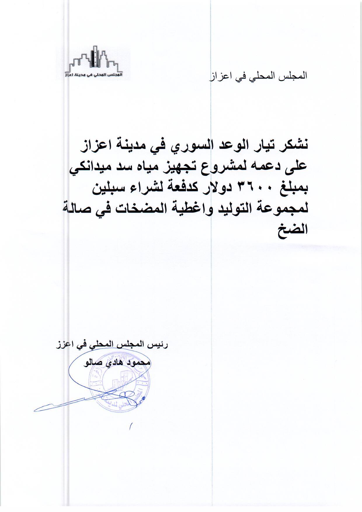 بيان شكر من المجلس المحلي في مدينة اعزاز لتيار الوعد السوري على تقديمه مبلغ مالي لشراء على دعمه لمشروع تجهيز مياه سد ميدانكي بمبلغ مالي