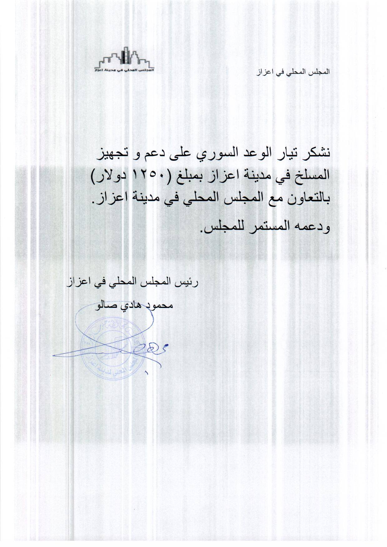 بيان شكر من المجلس المحلي في مدينة اعزاز لتيار الوعد السوري على تقديمه مبلغ مالي لشراء على دعمه لمشروع تجهيز المسلخ في مدينة اعزاز بمبلغ مالي