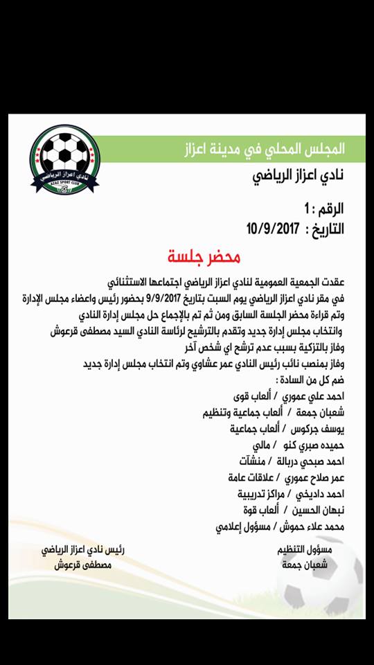 محضر اجتماع نادي اعزاز الرياضي بتاريخ 10/9/2017