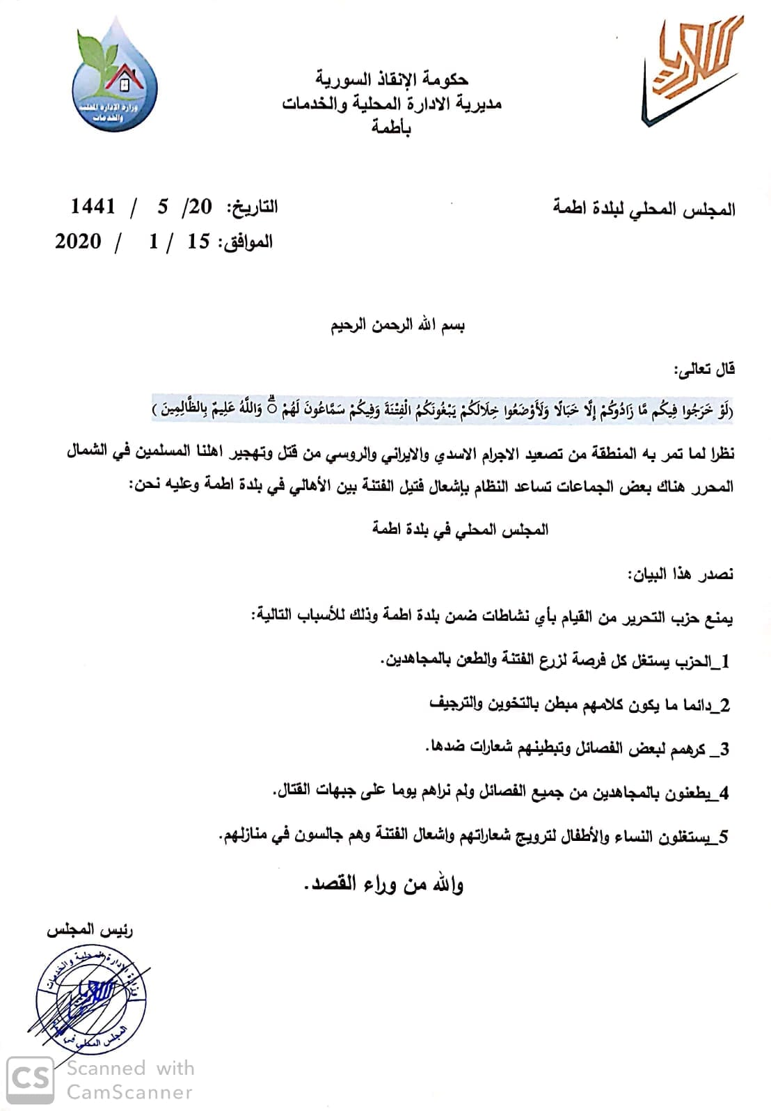 تعميم من المجلس المحلي لقرية أطمة بمنع حزب التحرير بالقيام بأي نشاطات ضمن بلدة أطمة