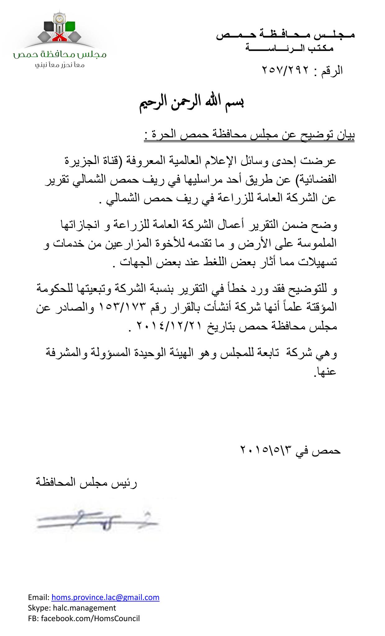 بيان توضيح من مجلس محافظة حمص الحرة حول تقرير (قناة الجزيرة الفضائية) عن طريق أحد مراسليها في ريف حمص الشمالي عن الشركة العامة للزراعة في ريف حمص الشمالي