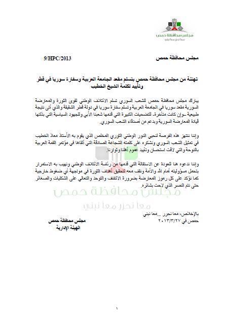 تهنئة من مجلس محافظة حمص بتسلم مقعد الجامعة العربية وسفارة سوريا في قطر وتأييد لكلمة الشيخ الخطيب