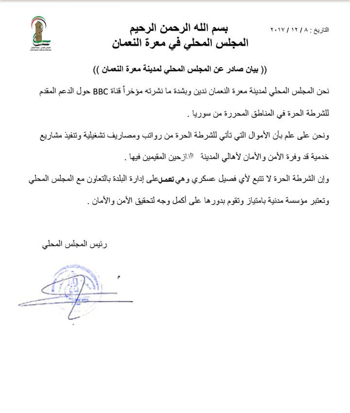 المجلس المحلي في معرة النعمان يدين وبشدة مانشرته قناة ل BBC حول الدعم المقدم للشرطة الحرة في المناطق المحررة من سوريا