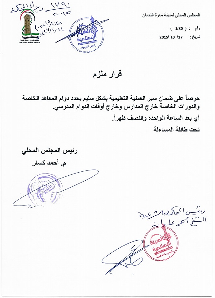 قرار إداري من المجلس المحلي في معرة النعمان بتحديد دوام المدارس الخاصة والمعاهد الخاصة خارج أوقات الدوام المدرسي