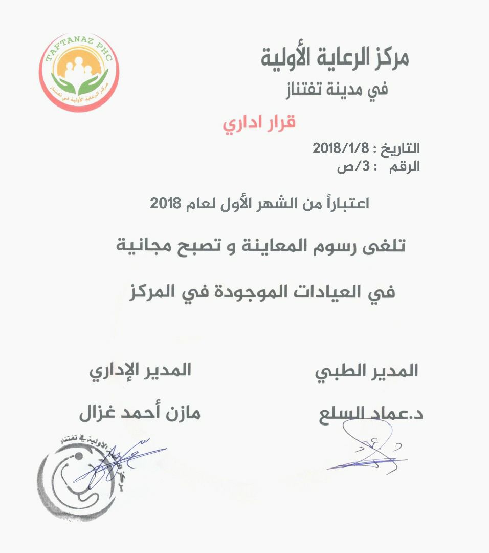 قرار إداري من مركز الرعاية الأولية في تفتناز بإلغاء رسوم المعاينة وجعلها مجانية