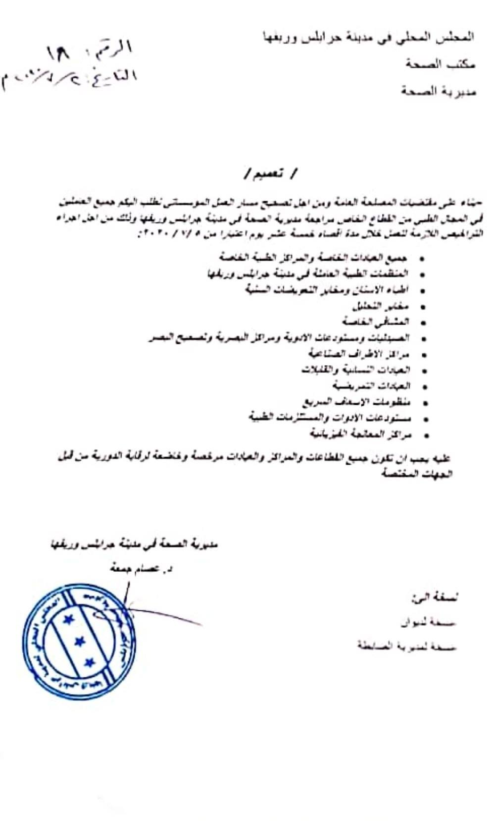 -بناء على مقتضيات المصلحة العامة ومن اجل تصحيح مسار العمل المؤسساتي نطلب اليكم جميع العاملين في المجال الطبي من القطاع الخاص مراجعة مديرية الصحة في مدينة جرابلس وريفها وذلك من اجل اجراء التراخيص اللازمة للعمل خلال مدة أقصاه خمسة عشر يوم اعتبارا من 5 /7 / 2020: