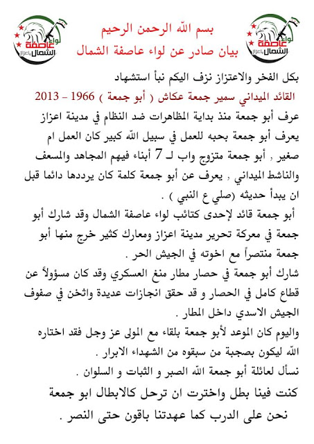 بيان تعزية بالقائد سمير عكاش أبو جمعة قائد كتيبة محمود عكاش