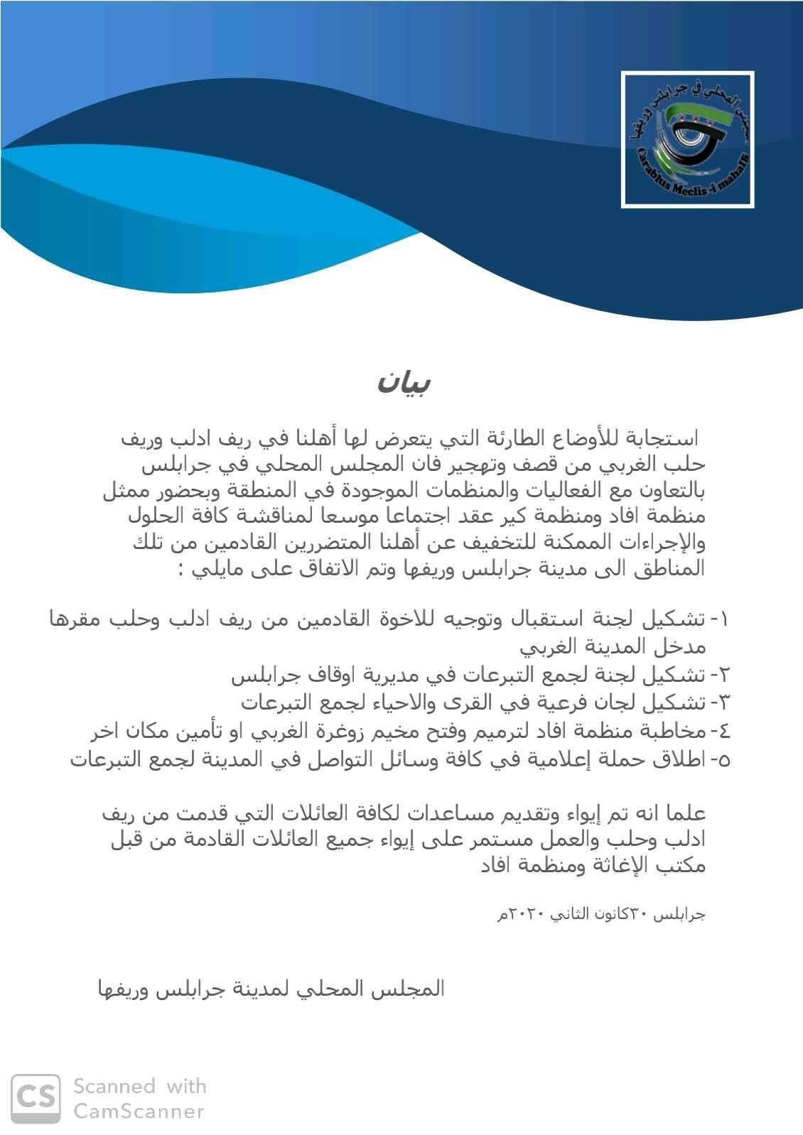 بيان من المجلس المحلي لمدينة جرابلس وريفها حول اتخاذ بعض الإجراءات والحلول لتخفيف معناة الأهالي النازحين من ريف إدلب وريف حلب الغربي