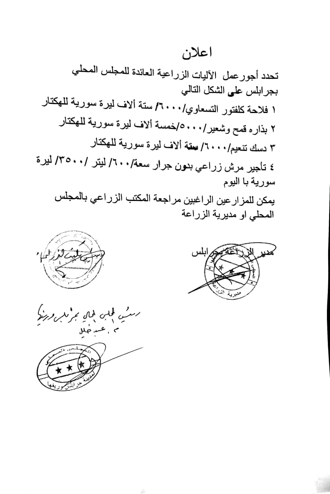 إعلان حول تحديد أجور عمل الآليات الزراعية العائدة للمجلس المحلي لمدينة جرابلس وريفها