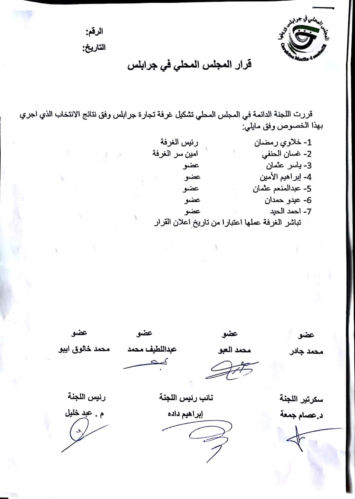 قرار حول قرار اللجنة الدائمة في المجلس المحلي بتشكيل غرفة تجارة جرابلس وفق نتائج الانتخاب الذي اجري بهذا الخصوص
