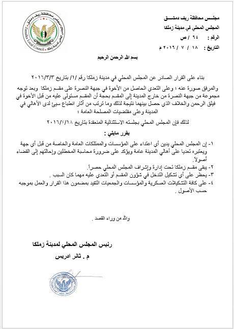 بيان من المجلس المحلي في مدينة زملكا يدين فيه أي اعتداء على الممتكات العامة والخاصة بعد اعتداء جبهة النصرة على مقسم زملكا